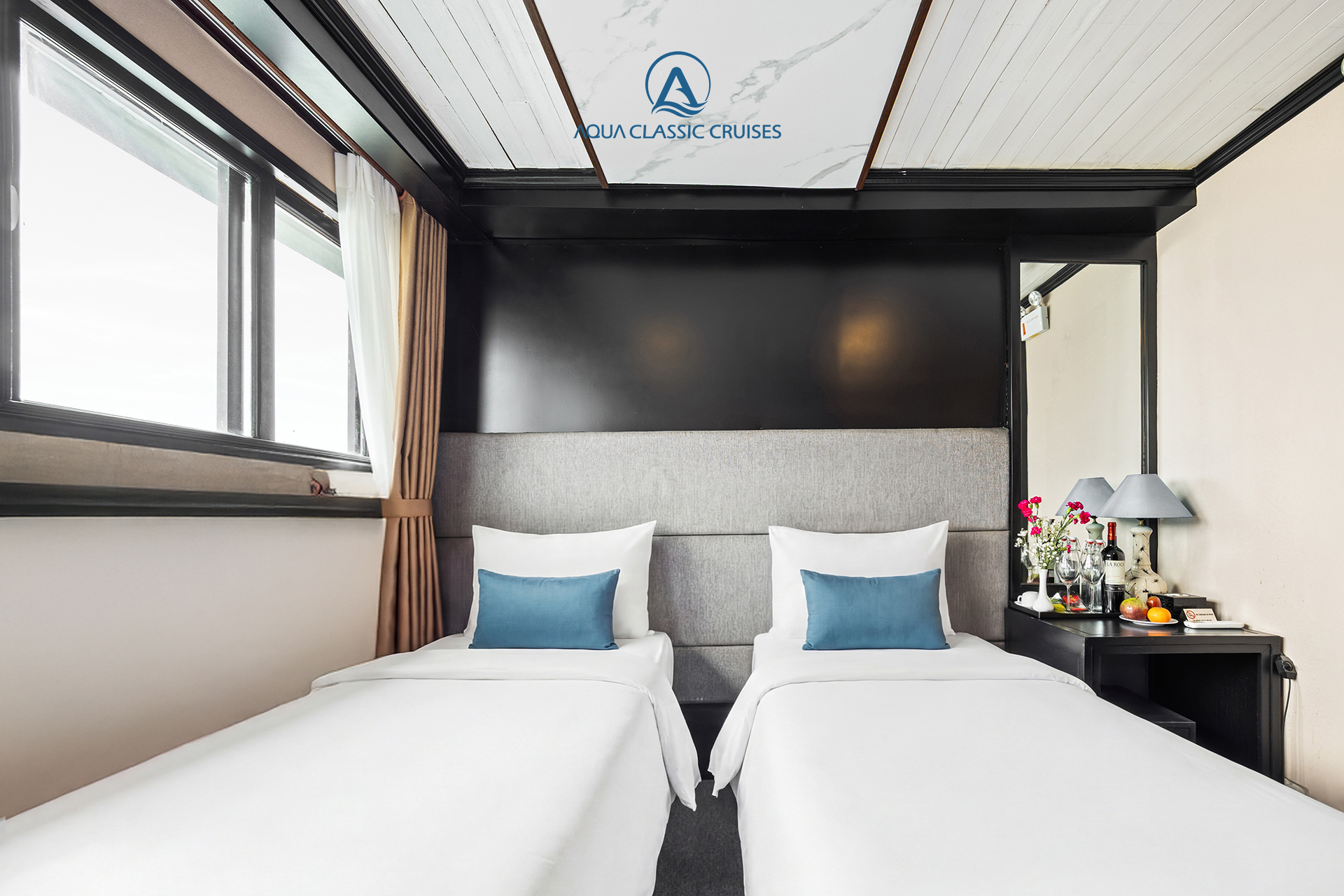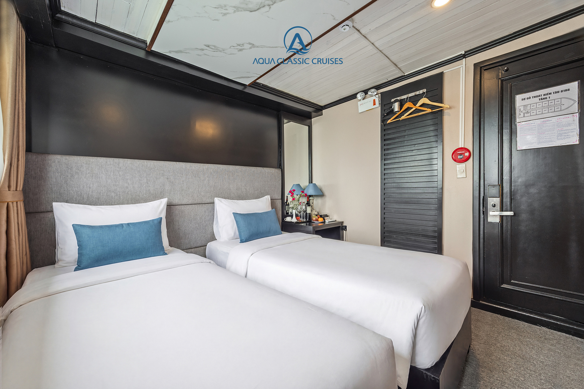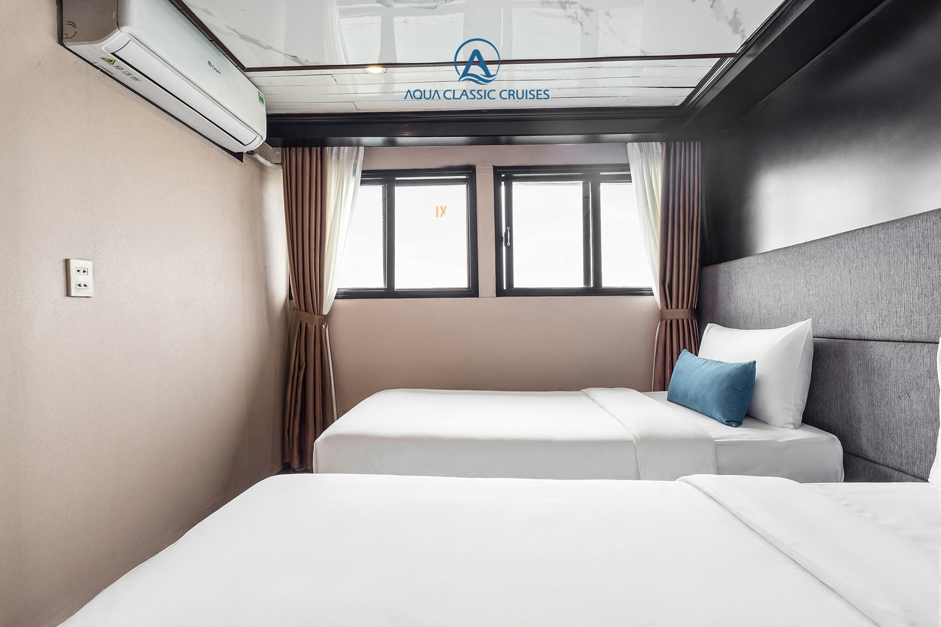 Phòng Standard trên du thuyền Aqua Classic nằm tại tầng 1, gồm 10 cabin, diện tích 18 m². Phòng được thiết kế hiện đại, gọn gàng và ấm cúng, trang bị đầy đủ tiện nghi cần thiết, mang đến không gian nghỉ dưỡng thoải mái và yên tĩnh cho du khách trong suốt hành trình khám phá Vịnh Hạ Long.
