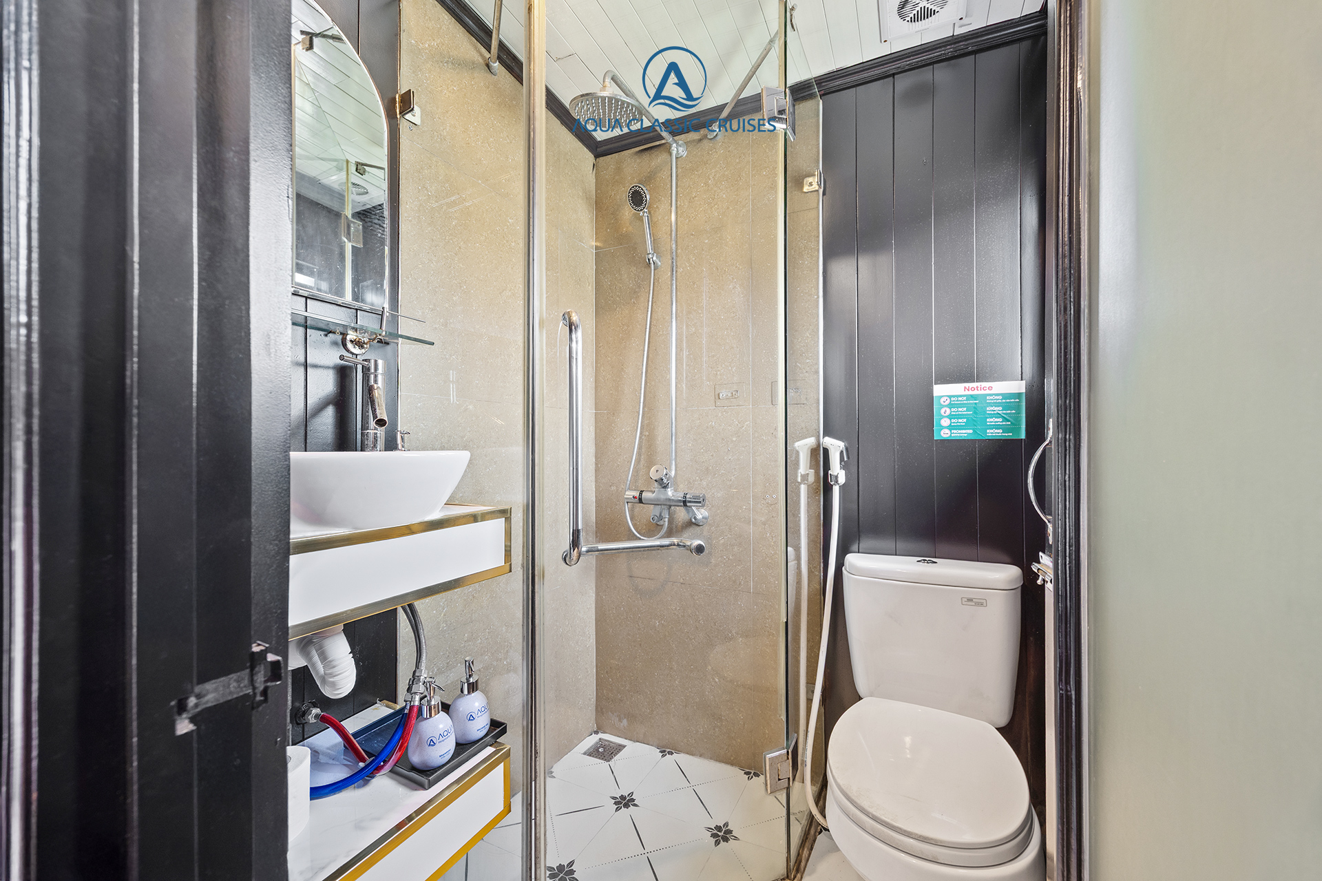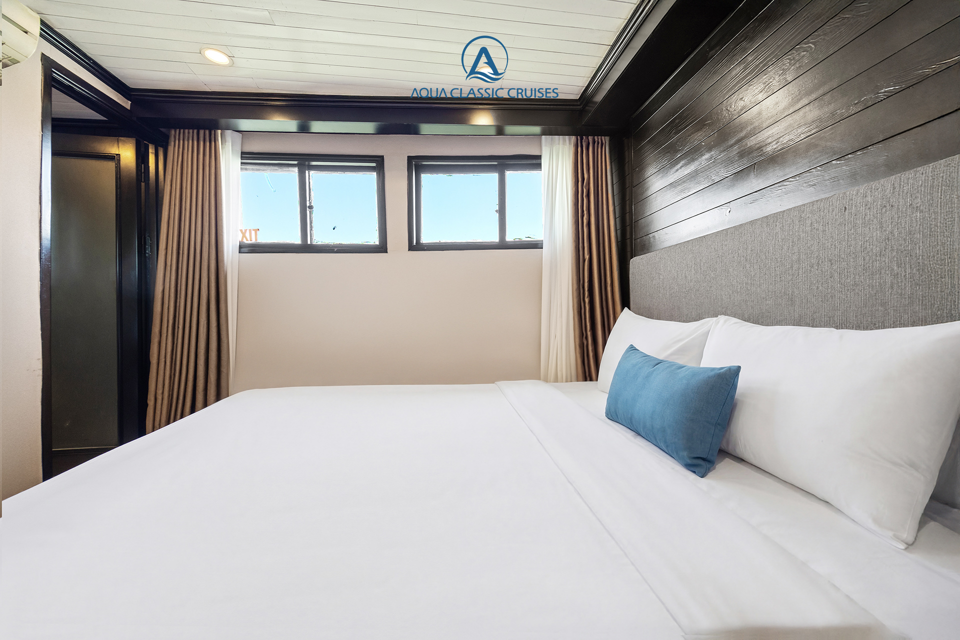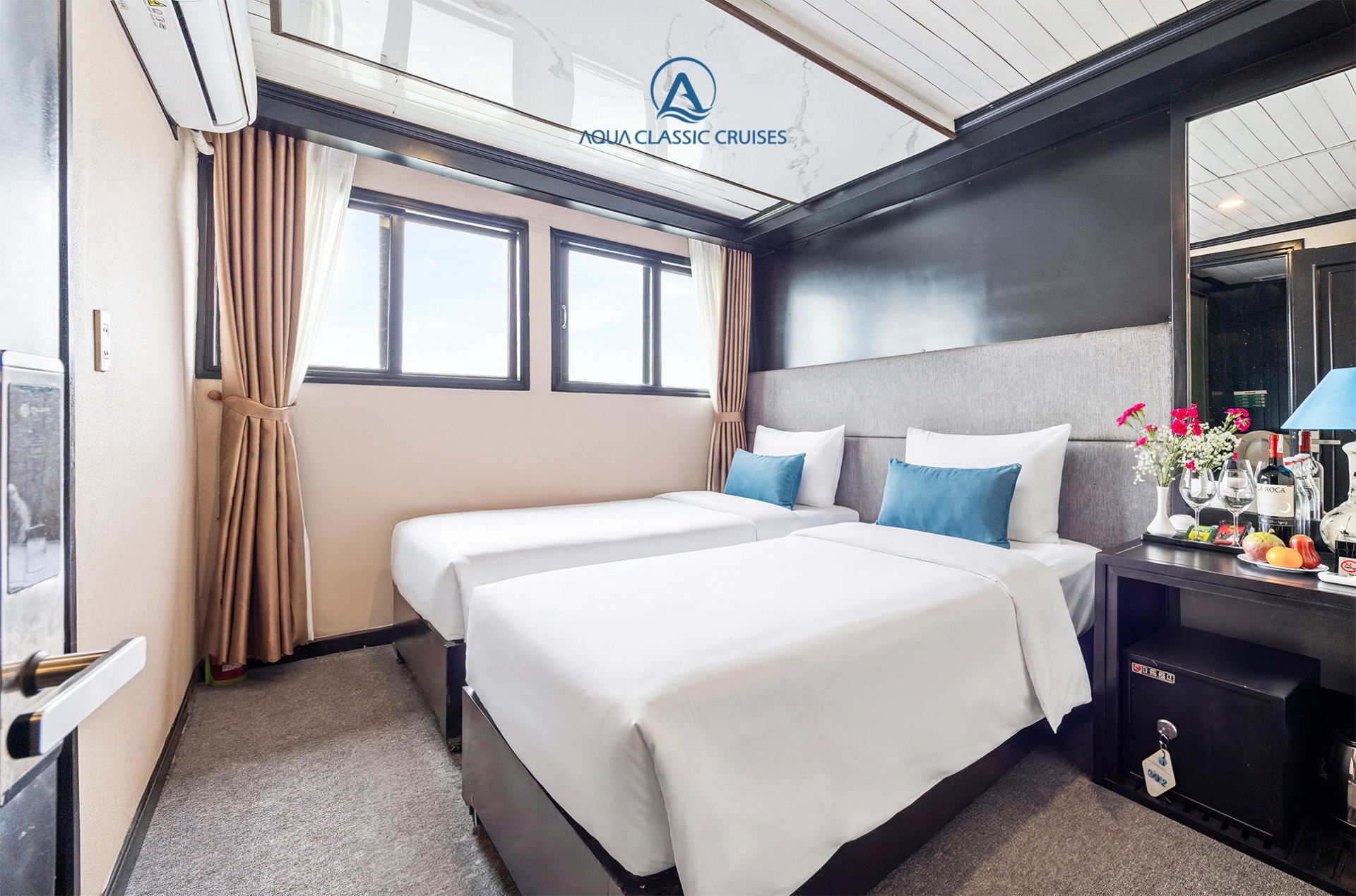 Phòng Standard trên du thuyền Aqua Classic nằm tại tầng 1, gồm 10 cabin, diện tích 18 m². Phòng được thiết kế hiện đại, gọn gàng và ấm cúng, trang bị đầy đủ tiện nghi cần thiết, mang đến không gian nghỉ dưỡng thoải mái và yên tĩnh cho du khách trong suốt hành trình khám phá Vịnh Hạ Long.